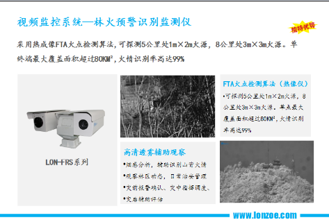 作為此次森林防火演練唯一的前端雙光譜熱成像森林防火監測攝像機,LON-FRS采用熱成像FTA火點檢測算法,可探測5公里處1m×2m火源,8公里處3m×3m火源。單終端最大覆蓋面積超過80KM²,火情識別率高達99%??梢姽飧咔逋胳F輔助觀察,實現觀察林區動態、災前報警確認、災中指揮調度、災后輔助評估等。設備在林火演練中大顯神威,受到各界一致好評。